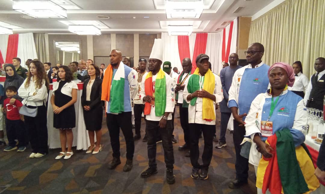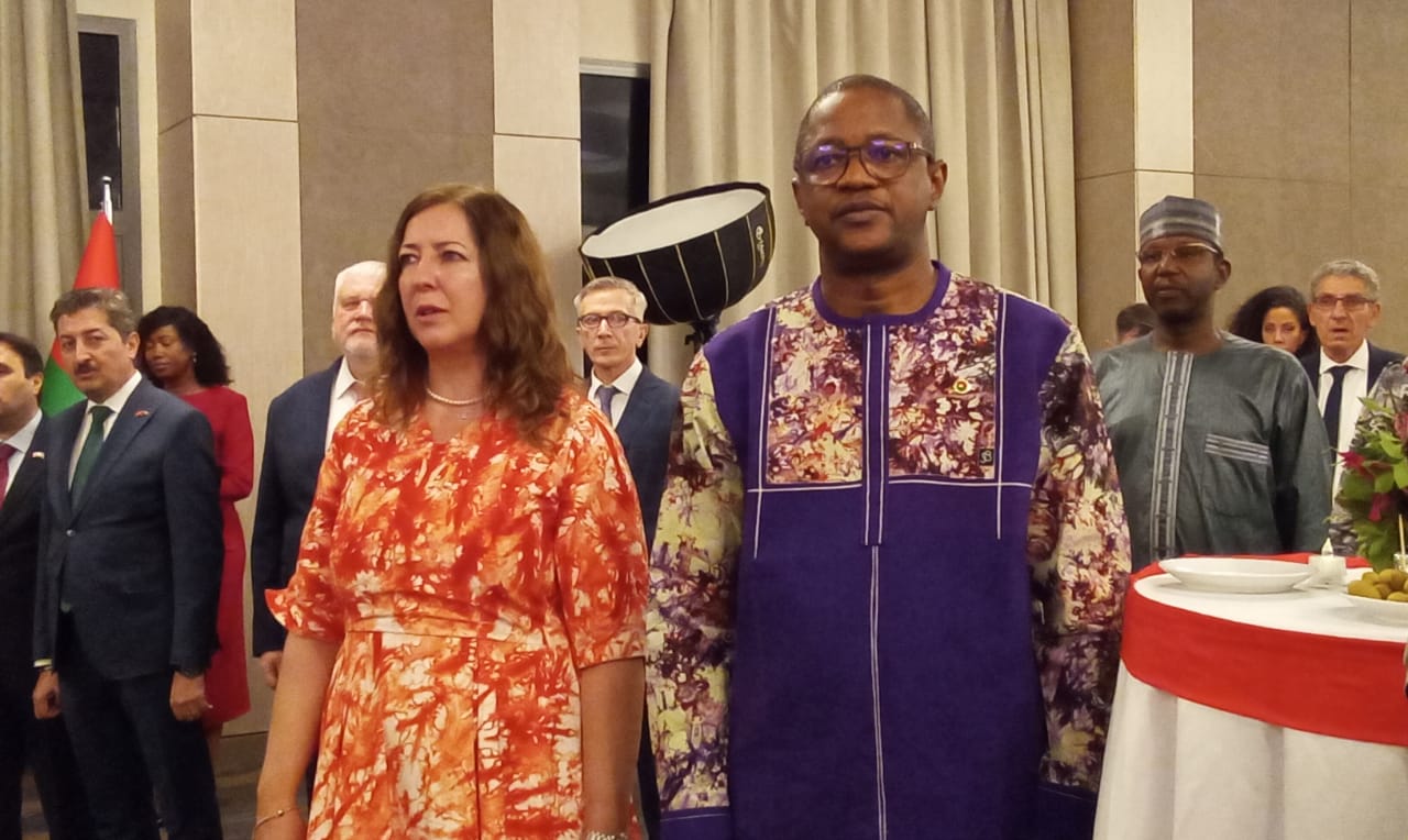Ici, le ministre des affaires étrangères, Karamoko Jean Marie Traoré, et Mme l’ambassadrice de la République de Türkiye au Burkina, Feriba Duygu Hokkaci Esirgen, pendant l’exécution des hymnes nationaux.
