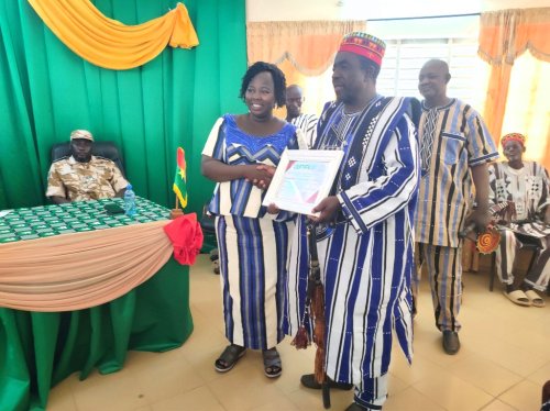 La présidente de la délégation spéciale, remettant une attestation de reconnaissance à une autorité coutumière.