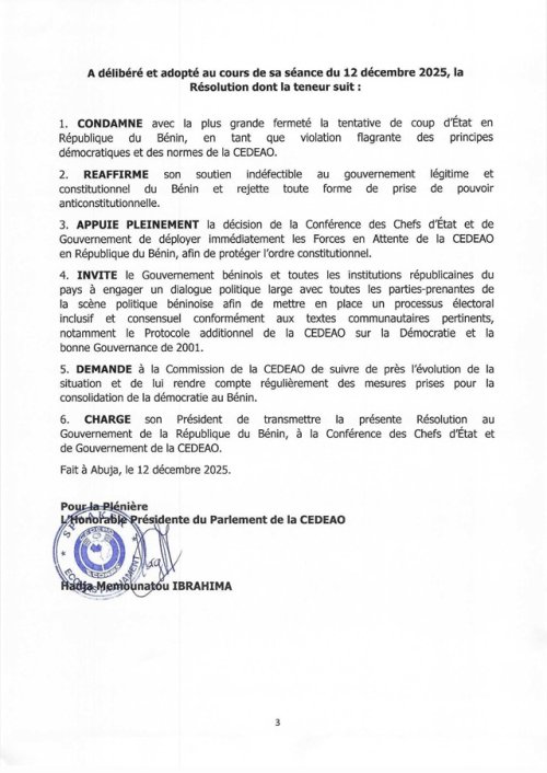 Le parlement de la CEDEAO réaffirme par ailleurs son soutien indéfectible au gouvernement légitime et constitutionnel du Bénin et rejette toute forme de prise de pouvoir par des moyens non démocratiques. Il souligne que les coups d’État constituent des précédents dangereux pour l’ensemble de la région et appellent une réponse ferme et solidaire de la Communauté.