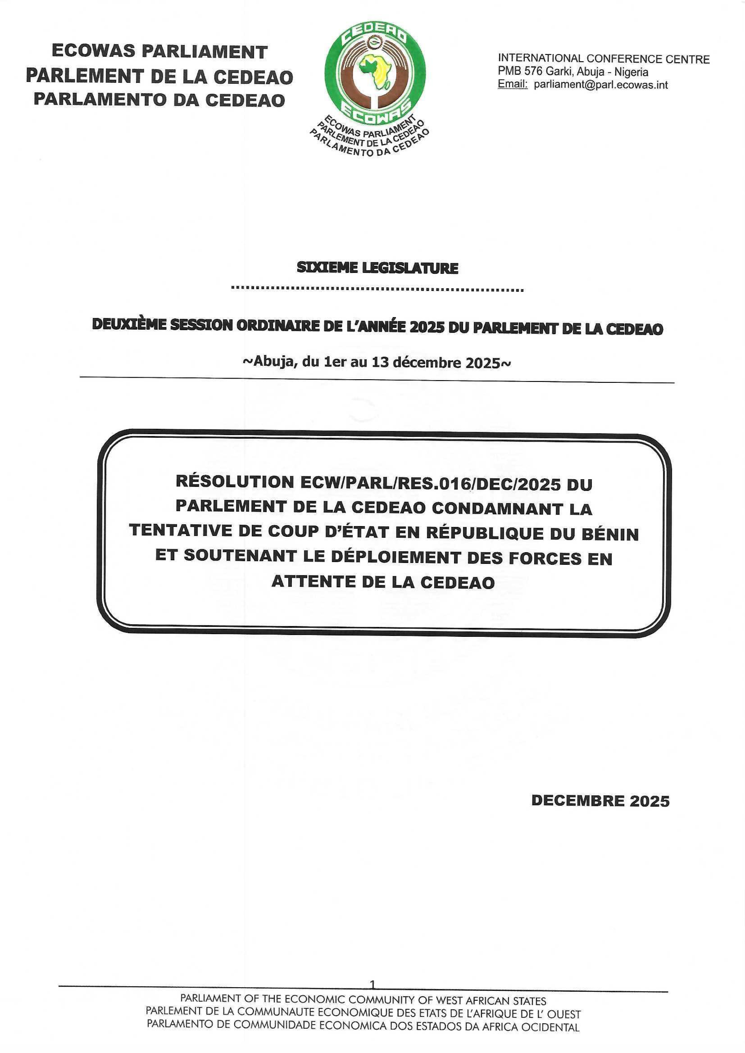 Réuni à Abuja du 1er au 13 décembre 2025, à l’occasion de sa deuxième session ordinaire de l’année, le parlement de la Communauté économique des États de l’Afrique de l’Ouest (CEDEAO) a adopté, le 12 décembre 2025, une résolution condamnant avec la plus grande fermeté la tentative de coup d’État au Bénin le 7 décembre dernier.