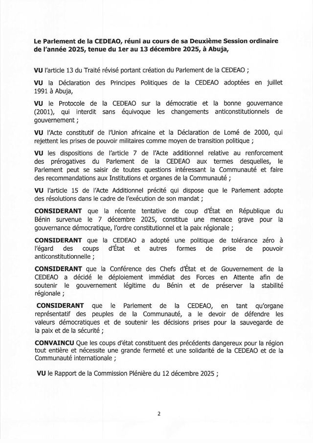 Le parlement de la CEDEAO réaffirme par ailleurs son soutien indéfectible au gouvernement légitime et constitutionnel du Bénin et rejette toute forme de prise de pouvoir par des moyens non démocratiques. Il souligne que les coups d’État constituent des précédents dangereux pour l’ensemble de la région et appellent une réponse ferme et solidaire de la Communauté.
