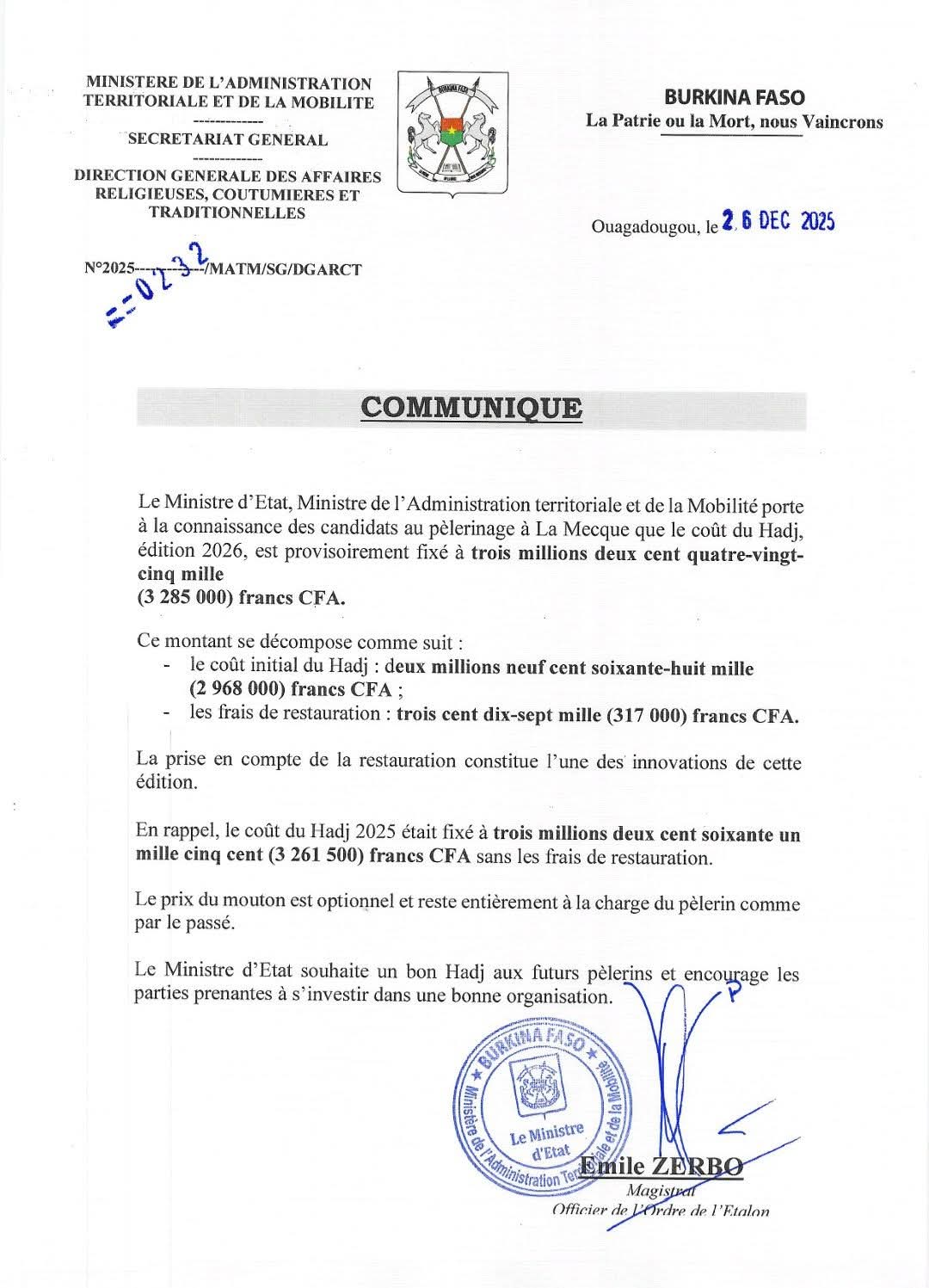 Le ministre d’État, ministre de l’Administration territoriale et de la Mobilité informe les candidats au pèlerinage à la Mecque que le coût du Hadj, édition 2026, est provisoirement arrêté à trois millions deux cent quatre-vingt-cinq mille (3 285 000) francs CFA.