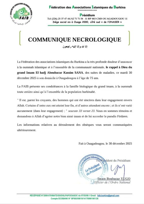 Le grand imam El hadj Aboubacar Kassim Sana est décédé le mardi 30 décembre 2025 à Ouagadougou, à l’âge de 75 ans, des suites de maladie. L’annonce a été faite par la Fédération des associations islamiques du Burkina (FAIB), qui a présenté ses condoléances à la famille du défunt, ancien grand imam de la ville de Ouagadougou, à la oummah islamique et à la nation entière. Les détails des obsèques seront communiqués ultérieurement. Rappelons que mercredi 12 août 2020, le ministre d’Etat Siméon Sawadogo lui rendait visite après son retour de France, où il s’était rendu pour des soins, et avait prié pour qu’il puisse recouvrer la santé.