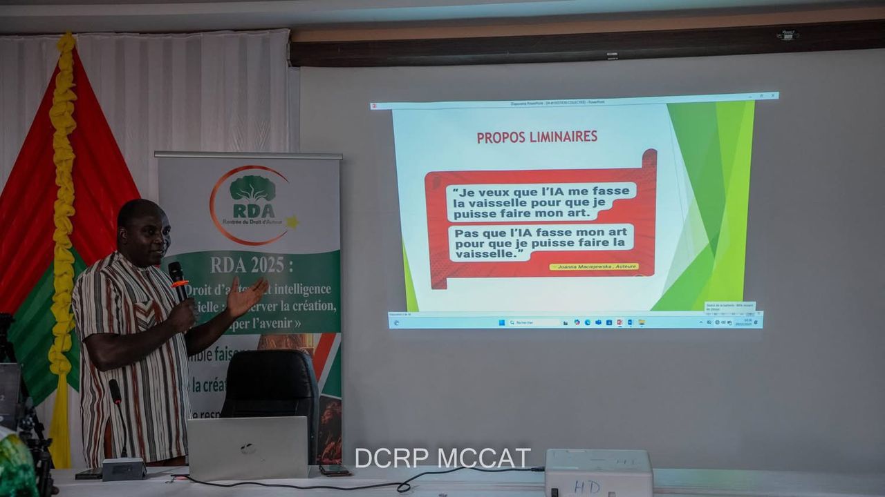En marge de la 7ᵉ rentrée du droit d’auteur du Bureau burkinabè du droit d’auteur (BBDA) tenue du 19 au 21 décembre 2025 à Manga, région du Nazinon, une conférence inaugurale a été animée par le Pr Dominique Kabré, agrégé des facultés de droit, professeur titulaire à l’université Thomas Sankara, expert en droit du numérique, autour du thème : « Droit d’auteur à l’ère de l’intelligence artificielle : comment repenser la gestion collective ? ». Une réflexion prospective qui a permis de poser les grands défis juridiques soulevés par l’essor fulgurant de l’intelligence artificielle (IA) dans le champ de la création.