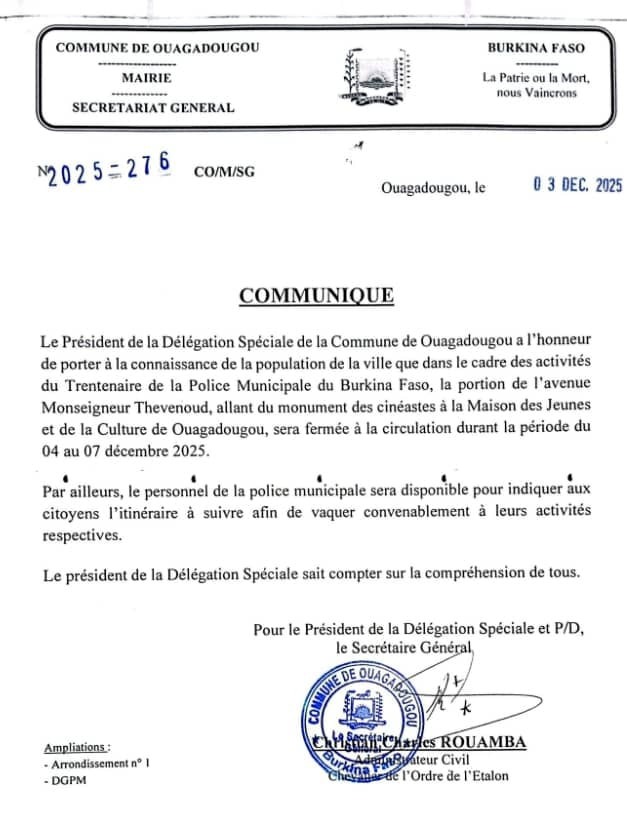À l’occasion du 30ᵉ anniversaire de la Police municipale du Burkina Faso, la Commune de Ouagadougou annonce la fermeture d’une partie de l’avenue Monseigneur Thévenoud, du 4 au 7 décembre 2025. Le communiqué précise que la partie concernée se situe entre le Monument des cinéastes et la Maison des jeunes et de la culture. Cette mesure vise à faciliter le déroulement des activités commémoratives prévues durant ces quatre jours.