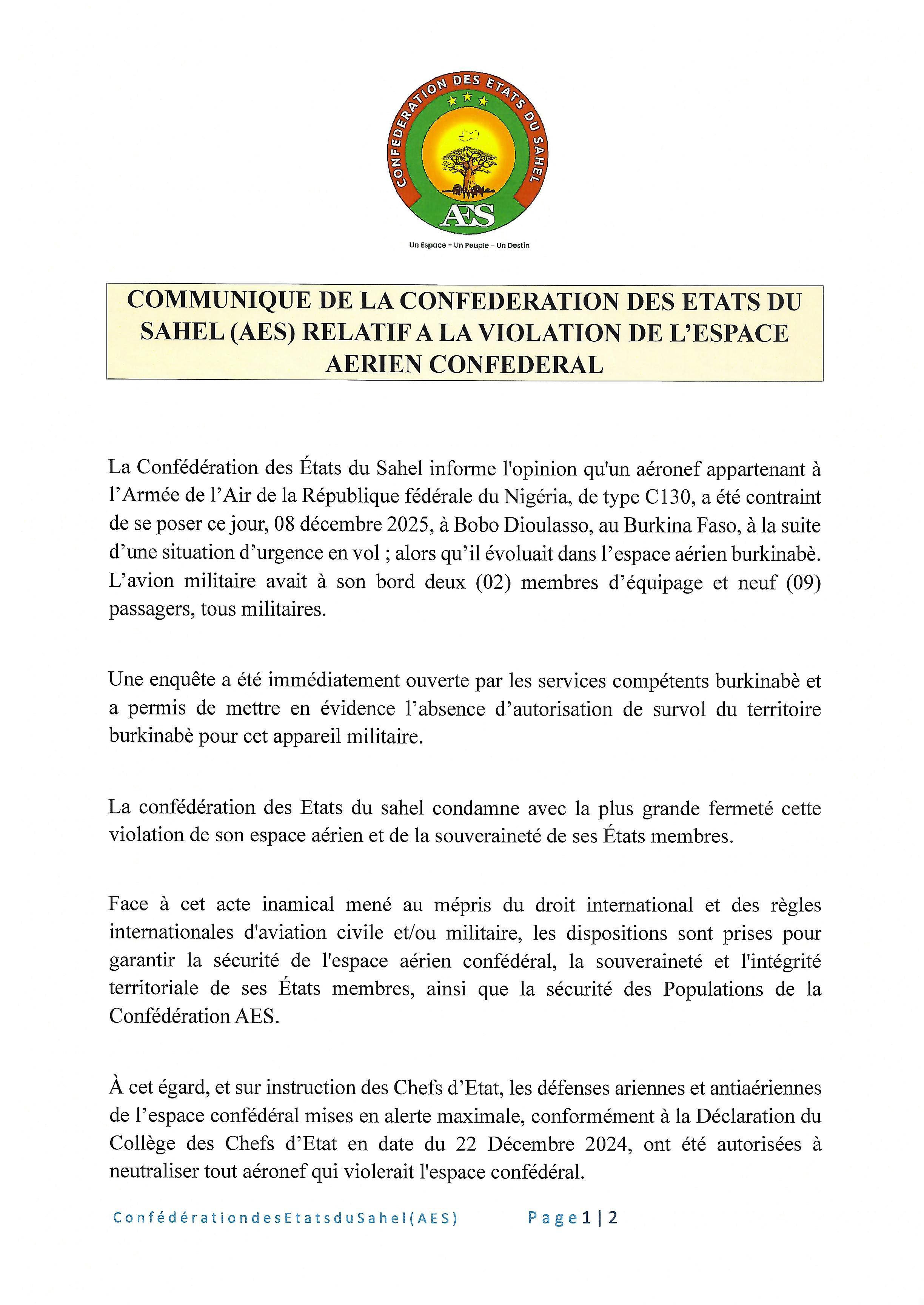 La Confédération des États du Sahel (AES) a annoncé qu’un avion militaire nigérian de type C130 a été contraint d’atterrir d’urgence, ce lundi 8 décembre 2025, à Bobo-Dioulasso au Burkina Faso. Le communiqué précise que l’aéronef, transportait 11 militaires, alors qu’une enquête révèle qu’il ne disposait d’aucune autorisation de survol du territoire burkinabè.